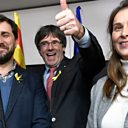 Image: Axed Catalan president Carles Puigdemont, flanked by former Catalan Health minister Antoni Comin and former Catalan Minister of Agriculture, Livestock, Fisheries and Food Meritxell Serret, reacts after the results of the regional elections in Catalonia. Credit: John Thys/AFP/Getty Images