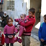 (Photo: Syrian baby Karim Abdallah who lost his left eye and his his mother being held by his brother in the rebel-held town of Beit Sawa, in the eastern Ghouta region on the outskirts of the capital Damascus. Credit: Getty Images)