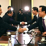 (Photo: South Korean Vice Unification Minister Chun Hae-Sung (2nd R) shakes hands with the head of North Korean delegation Jon Jong-Su. Credit: South Korean Unification Ministry via Getty Images)