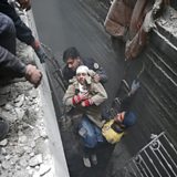 (Photo: Civil defence help an unconscious woman from a shelter in the besieged town of Douma. Credit: Reuters)