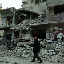 Picture: a Syrian man walking next to damaged buildings following regime air strikes in the Syrian rebel-held town of Douma, in the besieged Eastern Ghouta region. Credit: Hamza Al-Ajweh//AFP/Getty Images.