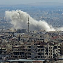 Picture: Smoke rises from the rebel-held enclave of Eastern Ghouta on the outskirts of the Syrian capital following fresh air strikes and rocket fire Credit: STRINGER/AFP/Getty Images