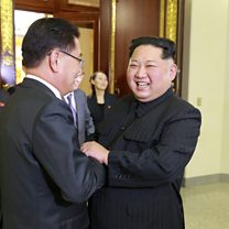 (Photo: Kim Jong-un greets a member of the special delegation of South Korea's President at a dinner on Monday 5 March. Image was released by North Korea's leader. Credit: Reuters)