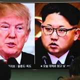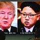 (Picture: People watch a television news report showing pictures of US President Donald Trump (L) and North Korean leader Kim Jong Un at a railway station in Seoul on March 9, 2018. Credit: JUNG YEON-JE/AFP/Getty Images)