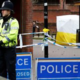 Picture: police officer stands on duty at a cordon near a bench covered in a protective tent at The Maltings shopping centre in Salisbury, southern England. Credit: Adrian Denis/AFP/Getty Images.