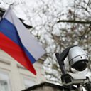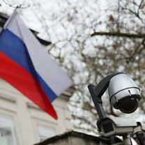 (Photo: Security cameras and a flag outside the consular section of Russia's embassy in London. Credit: Reuters)