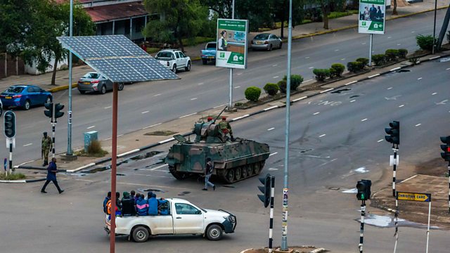 Armoured vehicles are patrolling the streets of the Zimbabwean capital Harare following shootings and explosions overnight. OS broadcasts from the BBC Africa Hub on the 5th floor of the New Broadcasting House. Also today; conversation in Hollywood with people who work in film industry about the sexual harassment allegations that have emerged in the last few weeks.
