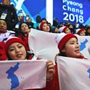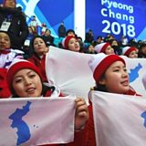 (Photo: North Korean cheerleaders with a unified Korean flag at the Winter Olympics / Credit: AFP)