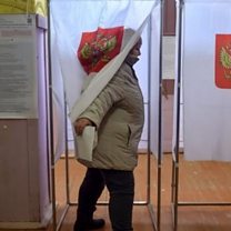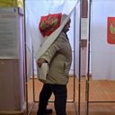 (Picture: Woman pulling back curtain at ballot box in Russia Credit: AFP)
