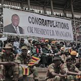 (Image: The image of Zimbabwean president Emmerson Mnangagwa behind some of soldiers at Harare International Stadium in Harare on 24th November 2017. Credit: Belal Khaled/NurPhoto/Getty Images)