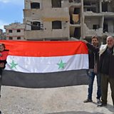 Picture: Syrian civilians hold their national flag in the former rebel-held town of Jobar, recently taken by the regime forces, in Eastern Ghouta, on April 1, 2018 Credit: AFP/Getty.