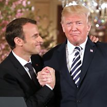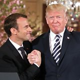 Picture: US President Donald Trump and French President Emmanuel Macron shake hands during a joint press conference at the White House in Washington, DC, on April 24, 2018. Credit: AFP/Getty Images