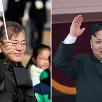 Picture: Mr Kim, right, is set to take a historic step when he attends his summit with South Korean leader Moon Jae-in. Credit: Getty Images.