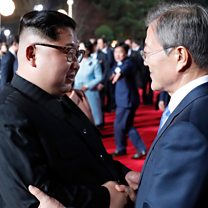 Picture: North Korea's leader Kim Jong Un and South Korea's President Moon Jae-in bid farewell at the end of their summit Credit: KOREA SUMMIT PRESS POOL/AFP/Getty Images