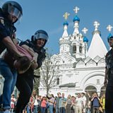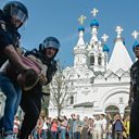 Picture: Russian police officers detain a protester during an unauthorised anti-Putin rally on May 5, 2018 in Moscow. Credit: Getty Images