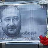 (Image: A picture of the Russian opposition journalist Arkady Babchenko on a fence of the Russian embassy in Kiev. Credit: EPA/Stepan Franko)