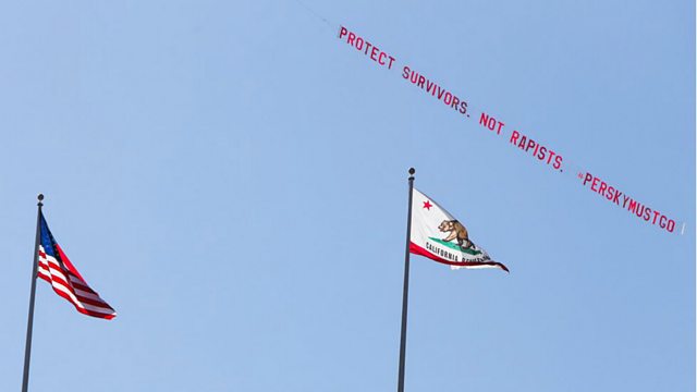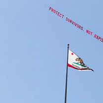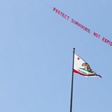 Picture: a plane flies over Stanford University with a banner reading 'Protect Survivors. Not Rapists. #PerskyMustGo'. Credit: Getty Images.