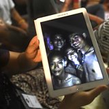 Photo: Relatives of the missing boys show photos of them after they and their coach were found alive in the cave where they've been missing for over a week. Credit: Linh Pham/Getty Images