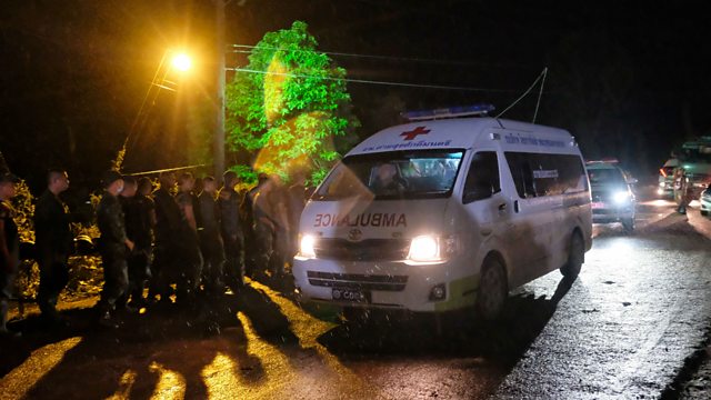 The operation to free twelve boys and their coach trapped in a cave in northern Thailand has been temporarily suspended. Four boys have been brought above ground so far in good health, according to rescuers. Also in the programme: A train derailment in Turkey kills at least ten passengers; floods in central and western Japan could affect up to five million people.