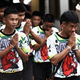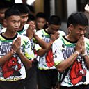 The twelve boys rescued from a flooded cave network hold a press conference before going home.