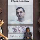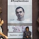 Picture: A portrait of Ukrainian film director Oleg Sentsov with hashtag 'Freesentsov' and text 'Oleg Sentsov-prisoner of Kremlin' is seen in a shop's window in the centre of Kiev. Credit: Pavlo Conchar/SOPA Images/LightRocket via Getty Images.