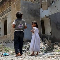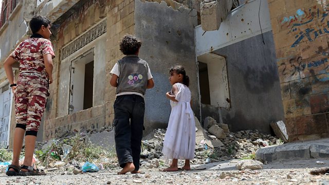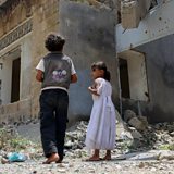(Photo: Displaced Yemeni children from Hodeida province play in a street, September 2018. Credit: Getty)