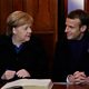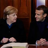 (Photo: French President Emmanuel Macron and German Chancellor Angela Merkel inside the train carriage where the WWI armistice was signed. Credit: Getty)