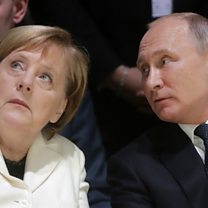 (Photo: Germany's Chancellor Angela Merkel and Russia's President Vladimir Putin attend the Paris Peace Forum. Credit: Mikhail Metze/Getty Images)