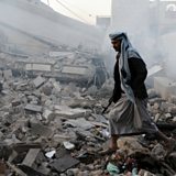 (Photo: A man walks on rubble of a building destroyed in airstrikes. Credit: Mohammed Hamoud/Getty Images)