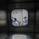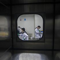 (Photo: Technicians are seen trough a contamination chamber as they work at the DNA research laboratory for gene sequencing. Credit: EPA)