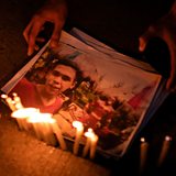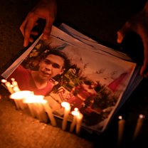 (Picture: supporters of Kian Delos Santos attend a vigil at the police station where the police officers convicted of his killing were stationed. Credit: AFP)