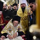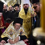 (Photo: Ecumenical Patriarch Bartholomew, the head of the global Orthodox Church, signs a document granting the Orthodox Church of Ukraine 'independence', at the Patriarchal Church of St. George in Istanbul. Credit: OZAN KOSE/Getty)