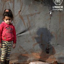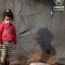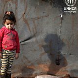 (Photo: A Syrian girl stands in the mud next to a tent at a camp for the displaced near the village of Shamarin. Credit: Getty Images)