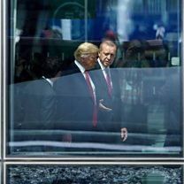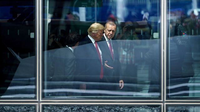 (Photo: US President Donald Trump (L) and Turkey's President Recep Tayyip Erdogan (R) speak as they attend the NATO summit. Credit: Getty Images)