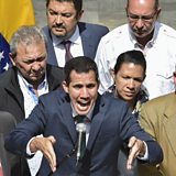Image: Venezuela's opposition leader and self-proclaimed acting president Juan Guaido speaks to the press at the Federal Legislative Palace, in Caracas, on February 4. Credit: Yuri Cortez/AFP/Getty Images.