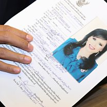 (Photo: Thai Raksa Chart party leader Preechapol Pongpanich, holds up application of candidate for Prime Minister, Thailand"s Princess Ubolratana Rajakanya Sirivadhana Barnavadi. Credit: Reuters)