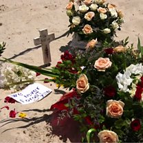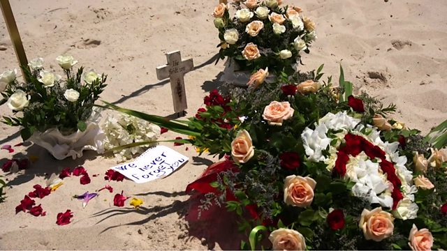 (Photo: Flowers left on a beach in Sousse one year after a militant attack; Credit: BBC)
