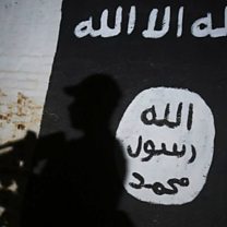 (Photo: A member of the Iraqi forces walks past a mural bearing the logo of the Islamic State (IS) group. Credit: Getty Images)