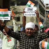 (Indian Muslims shout anti-Pakistani slogans as they celebrate the Indian Air Force strike. Credit: AFP/ Panthaky)