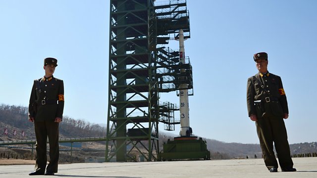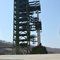 Picture: This file photo taken on April 8, 2012 shows two North Korean soldiers standing guard in front of the Unha-3 rocket at at the Sohae Satellite Launch Station in Tongchang-Ri. Credit: AFP/Getty Images.
