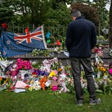 (Picture: A man pauses next to a New Zealand flag hung amongst flowers and tributes to the victims of Friday’s gun attack, 17th March 2019 in Christchurch, New Zealand. Credit: Carl Court/Getty Images)