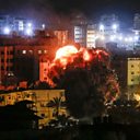 (Photo: Fire and smoke below above buildings in Gaza City during reported Israeli strikes. Credit: Getty Images)