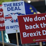 Image: Anti-Brexit placards are lined up on railings outside the Houses of Parliament in London. Credit: Paul Ellis/AFP/Getty Images.