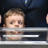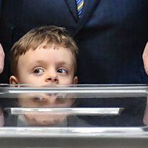 (Photo: Ukrainian President Petro Poroshenko (behind) speaks to the press as his grandson looks on at a polling station in Kiev. Credit: Getty Images)