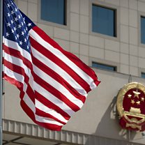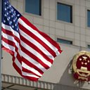 (Photo: The American flag flies near the national emblem of China. Credit: Getty Images.)