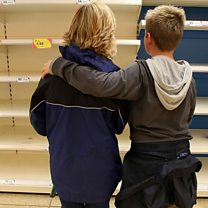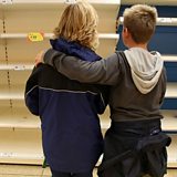 (Photo: a mother and son stand in front of empty supermarket shelves. Credit: Getty Images.)