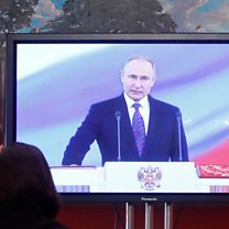 (Picture: Journalists watch a ceremony to inaugurate Vladimir Putin as President of Russia at a press centre in Moscow. Credit: Reuters)