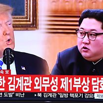(Picture: A TV news screen showing North Korean leader Kim Jong Un and US President Donald Trump in Seoul on May 16, 2018.