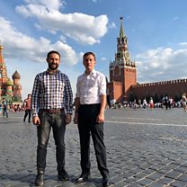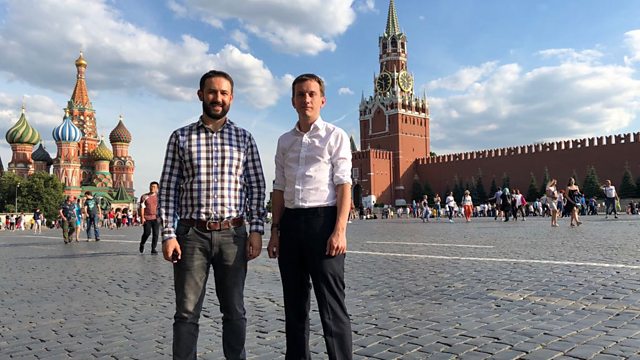 Our teams are live from Russia discussing politics and football and the latest from the 2018 World Cup. Also today, more than 230 migrants remain stranded off the coast of Malta aboard a German rescue ship. (Photo: Ben James and BBC Russian’s Petr Kozlov with the Kremlin and St Basil’s behind)