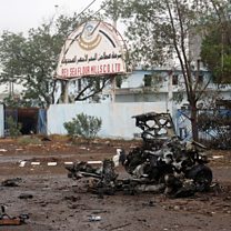 (Photo: A burnt car at the eastern entrance of the Yemeni city of Hodeida. Credit: Getty Images)